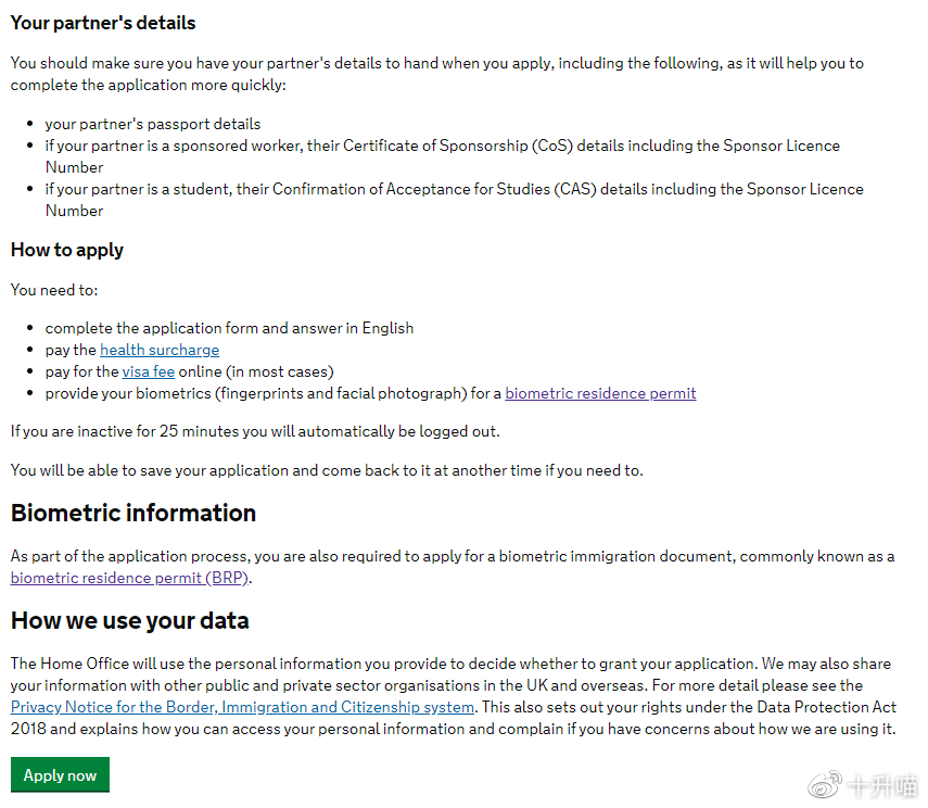Log in to the official website (gov.uk), search for your visa type, and follow the instructions under the "partner and children" section. The system will ask you a few questions (such as your location in the UK, possession of a European passport, and confirmation of visa type). After answering, you will enter the specific application page and click "apply now" to proceed. (Note: Be careful not to select the wrong option, as there are separate application processes for applying inside or outside the UK.)
